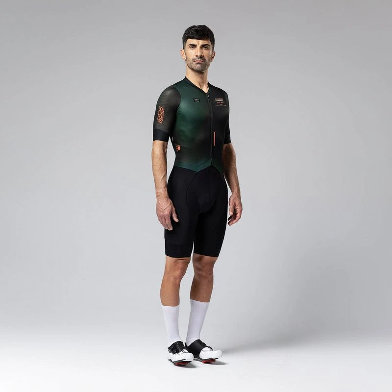 From the union of the Absolute bib shorts and a new and innovative upper part, our high aerodynamic performance full-length is born. A close fitting garment recommended for high temperatures and humidity levels. Made with high performance fabrics for high breathability, dryness and comfort.
